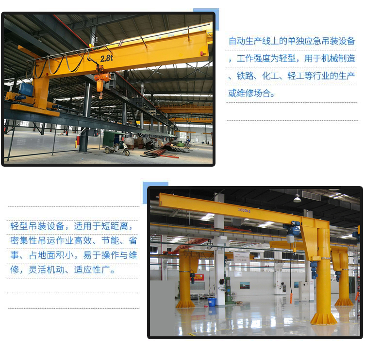 懸臂吊起重機是為適應現(xiàn)代化生產(chǎn)而制作的新一代輕型吊裝設備,配合了可靠性高的環(huán)鏈電動葫蘆尤其適用于短距離,使用頻繁,密集性吊運作業(yè),具有高效、節(jié)能、省事、占地面積小,易于操作與維修等特點。