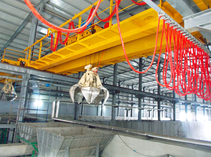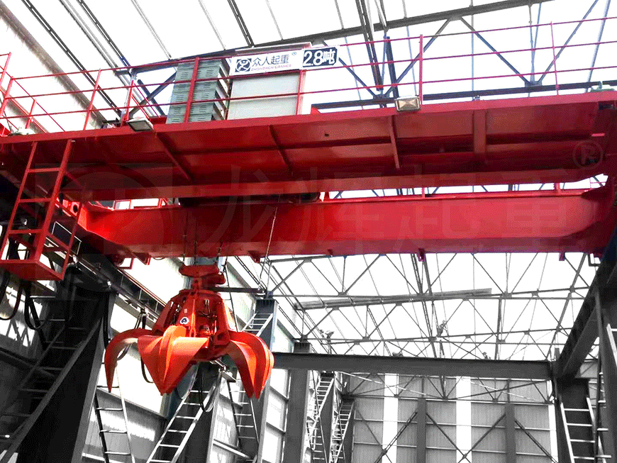 電動雙梁抓斗橋式起重機主要由箱形橋架、抓斗小車、大車運行機構(gòu)、司機室和電氣控制系統(tǒng)組成。取物裝置為能抓取散裝物料的抓斗。